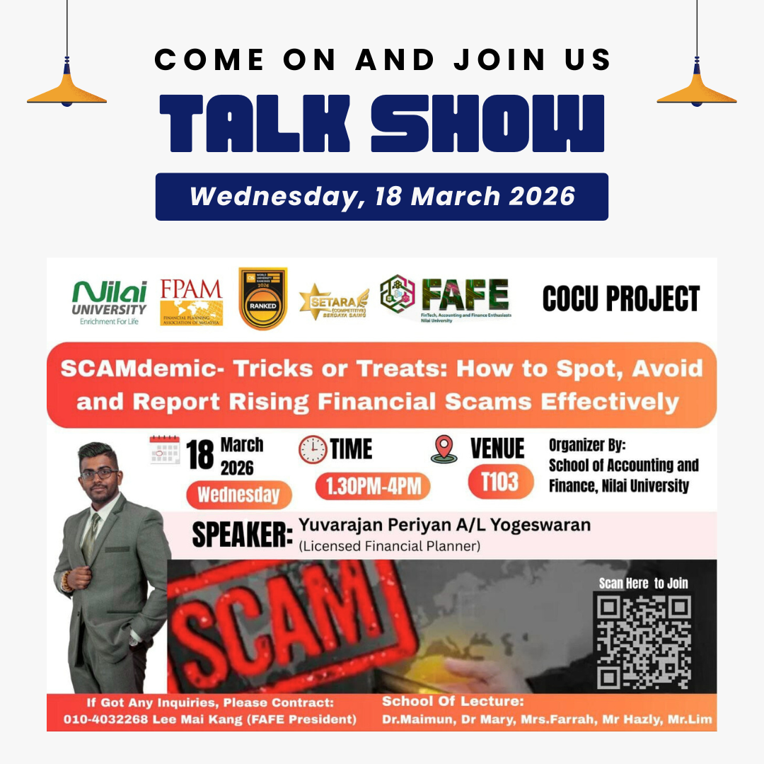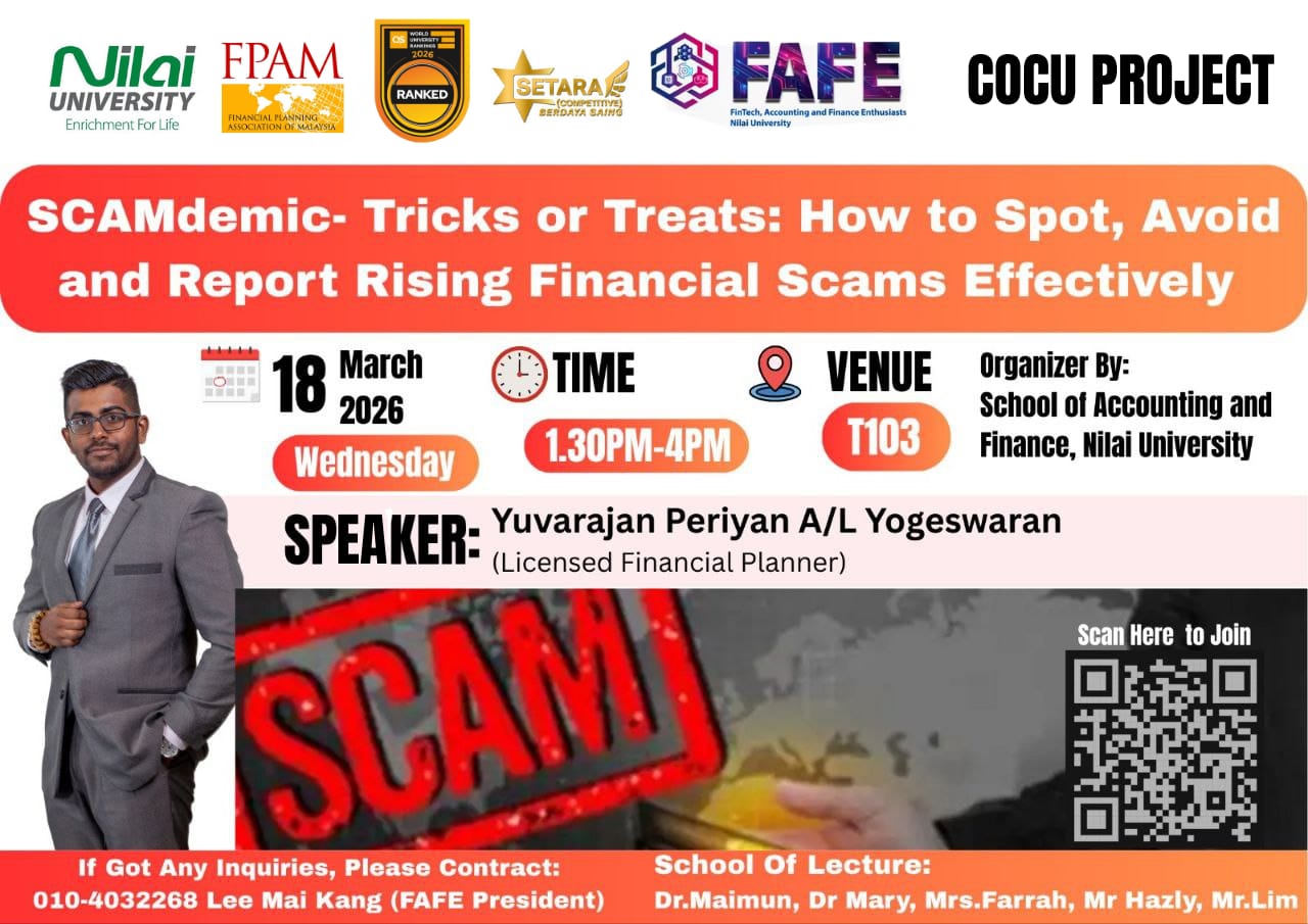 📢Financial Talk-SCAMdemic- Tricks or Treats By the Accounting & Finance Club‼️ by Saidatina Safia Binti Mohd Ruslan - Friday, 27 February 2026, 11:05 AM Permalink Discuss this topic (0 replies so far)