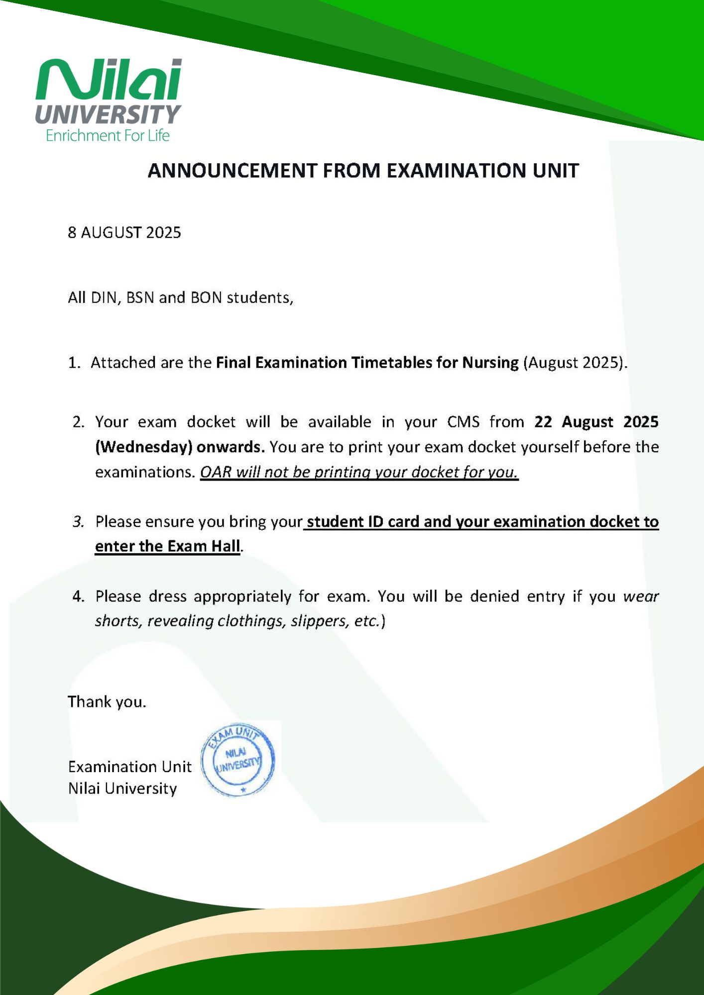 Final Examination Timetables for Nursing (August 2025) by NURSYAHIDAH NAFISAH BINTI ZAINI - Wednesday, 8 October 2025, 2:53 PM Number of replies: 0 Announcement Final Examination - DIN BSN BON- Aug 2025.docx DIN BSN BON Exam Timetable - AUG 2025.xls Permalink